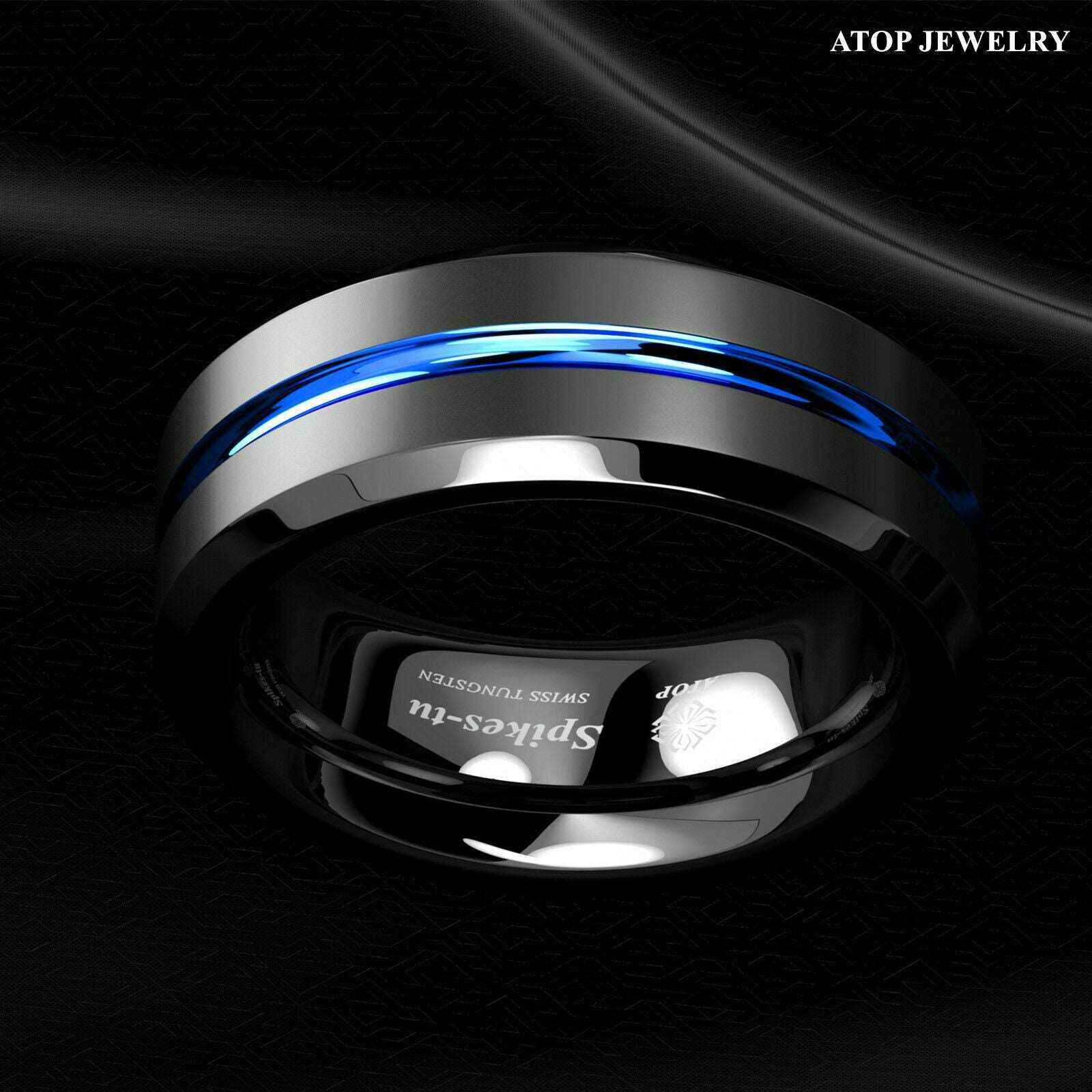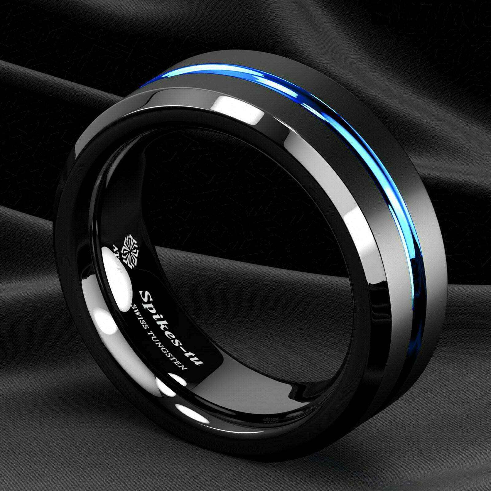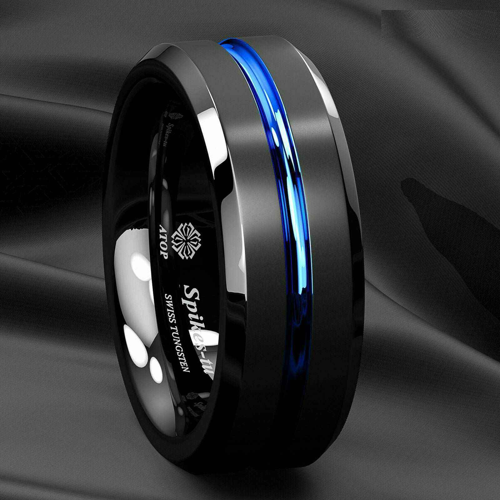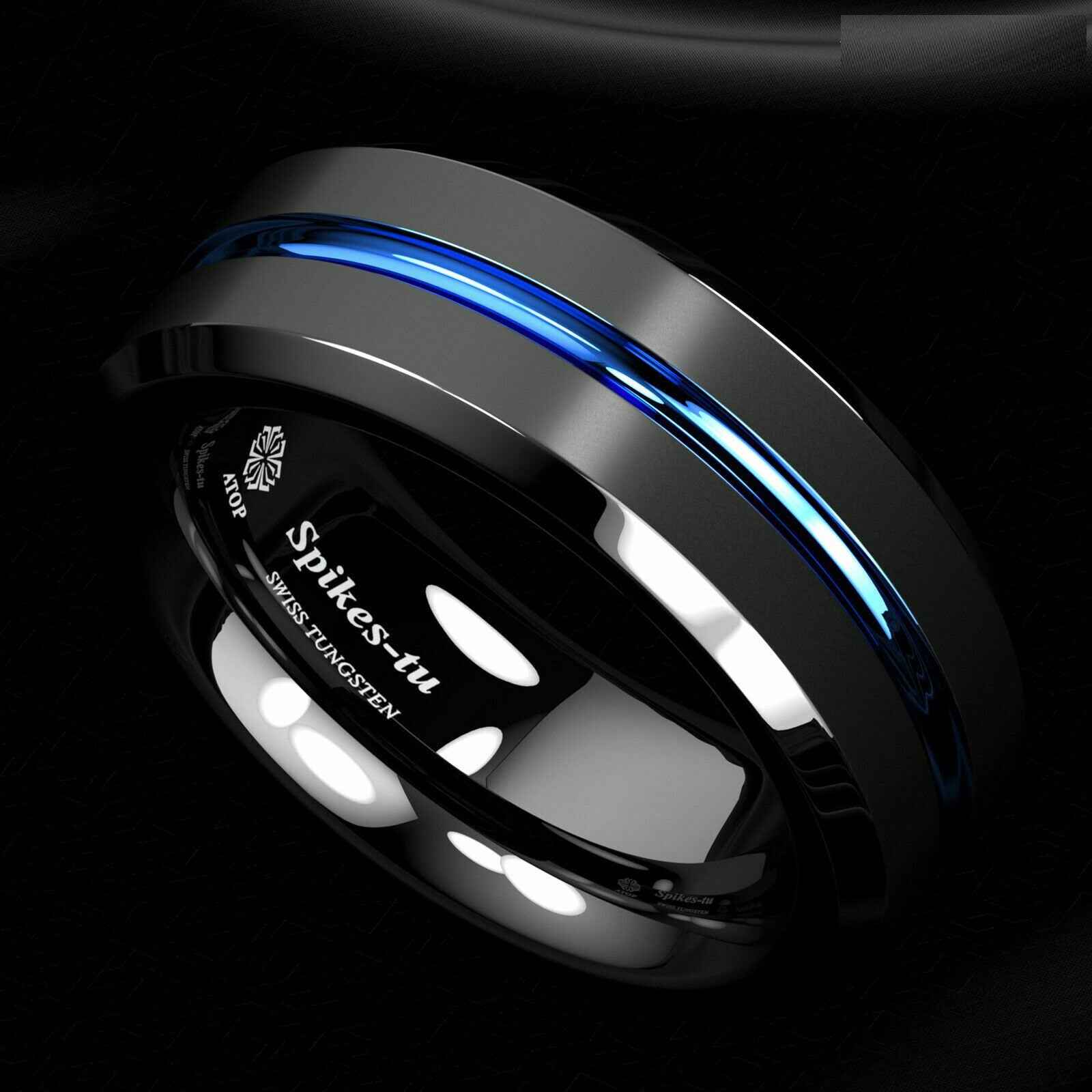 Blue Stripe Black Edge Tungsten Ring 8mm