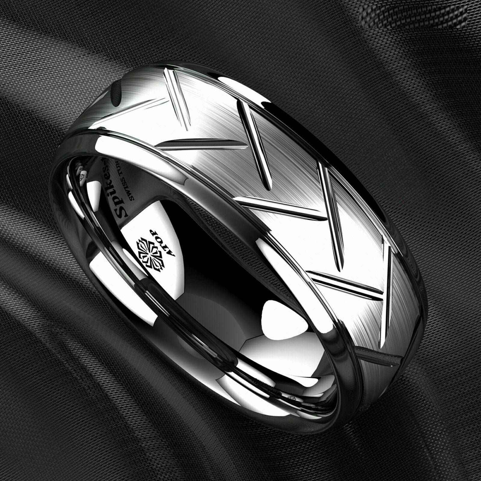 The 8mm width strikes the perfect balance between presence and comfort, making it ideal for everyday wear or as a distinguished men's wedding band or engagement ring. The elegant brushed silver finish gives it a contemporary, understated appeal, reflecting light subtly and adding a touch of rugged sophistication. This is a ring that speaks volumes without shouting.