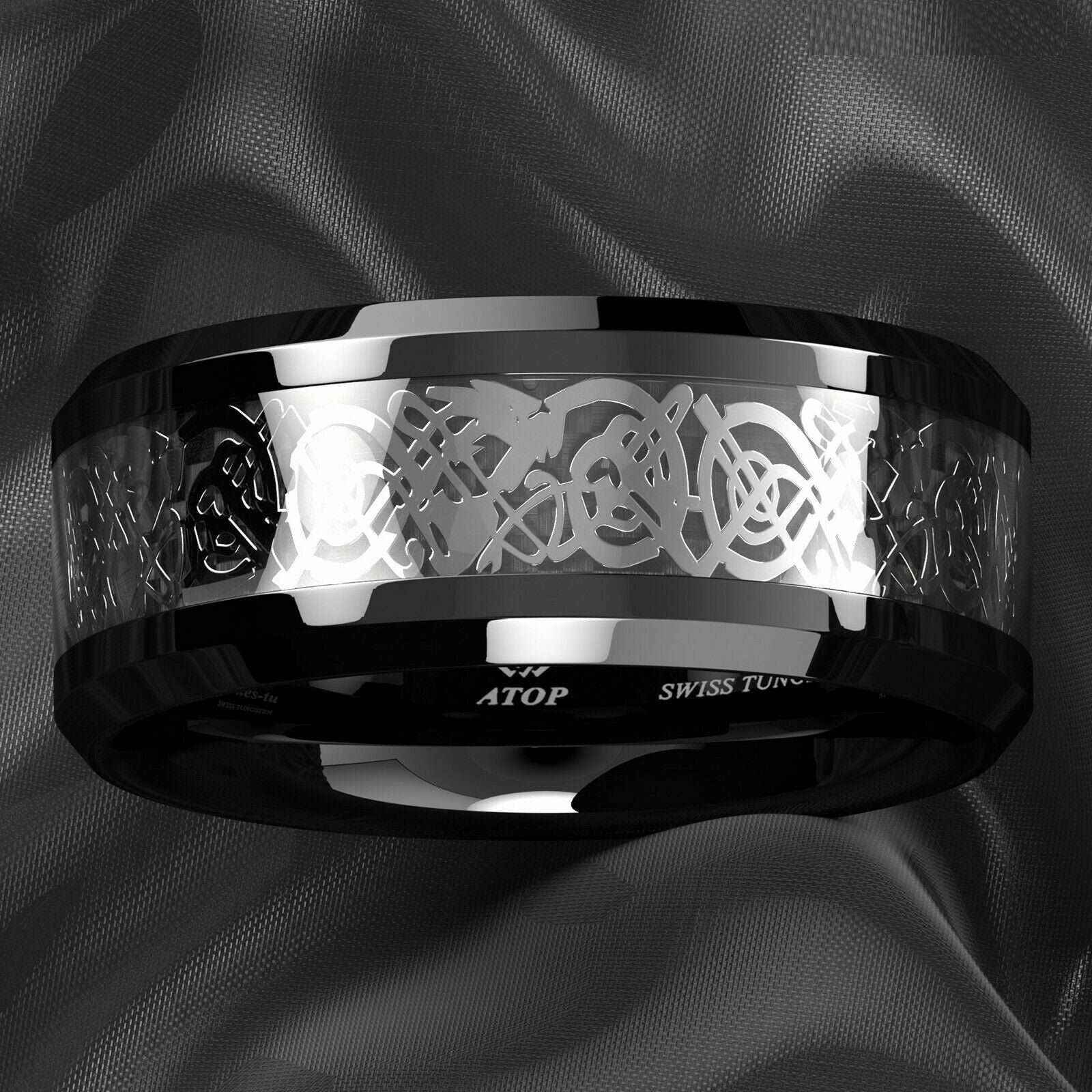 This 8mm tungsten ring combines ancient Celtic symbolism with modern durability. Featuring a polished silver finish and an intricately detailed Celtic dragon inlay, it represents strength, wisdom, and heritage.
